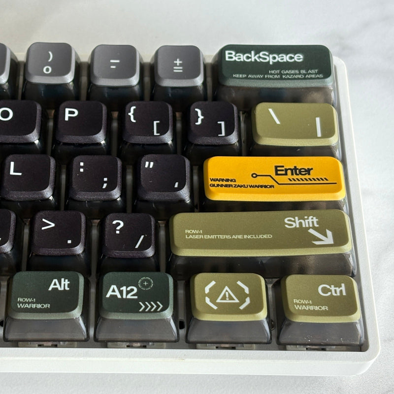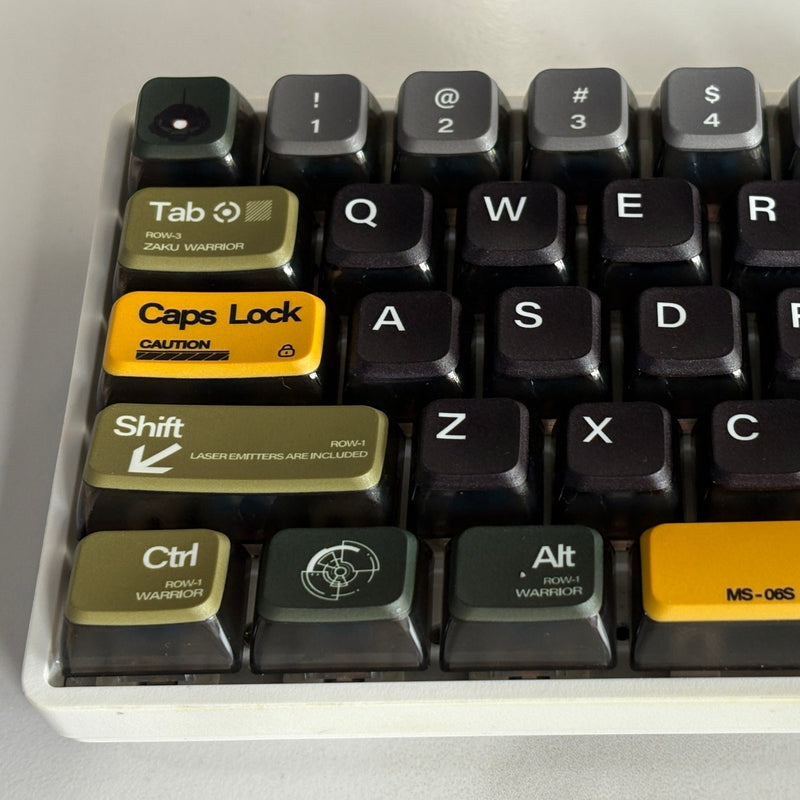 The Gundam Zaku Green Storm Keycap Set pays tribute to the classic Zaku Warrior with a bold green storm palette and mecha-inspired legends. Built in MDA profile for tall, rounded comfort, the set features side-translucent walls that let RGB lighting shine through at the edges. With five-side dye-sublimated artwork, every surface carries crisp, fade-resistant detail. Packaged in a protective box, it’s a striking upgrade for any mechanical keyboard.