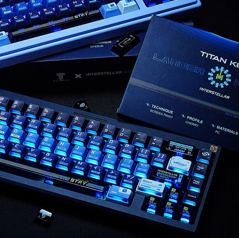 The Interstellar Keycap Set brings a deep-space palette and clean typography to your keyboard. Built in Cherry profile for familiar ergonomics, the expanded 151-key kit supports a wide range of layouts. PBT construction with dye-sublimated artwork keeps colors rich, while shine-through legends let your backlight glow clearly.